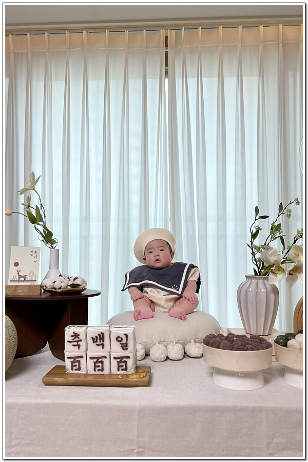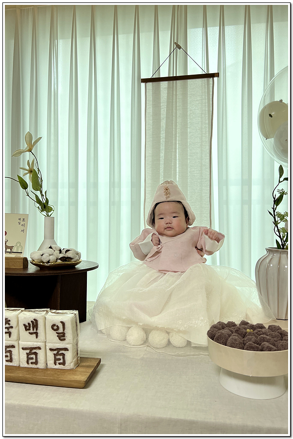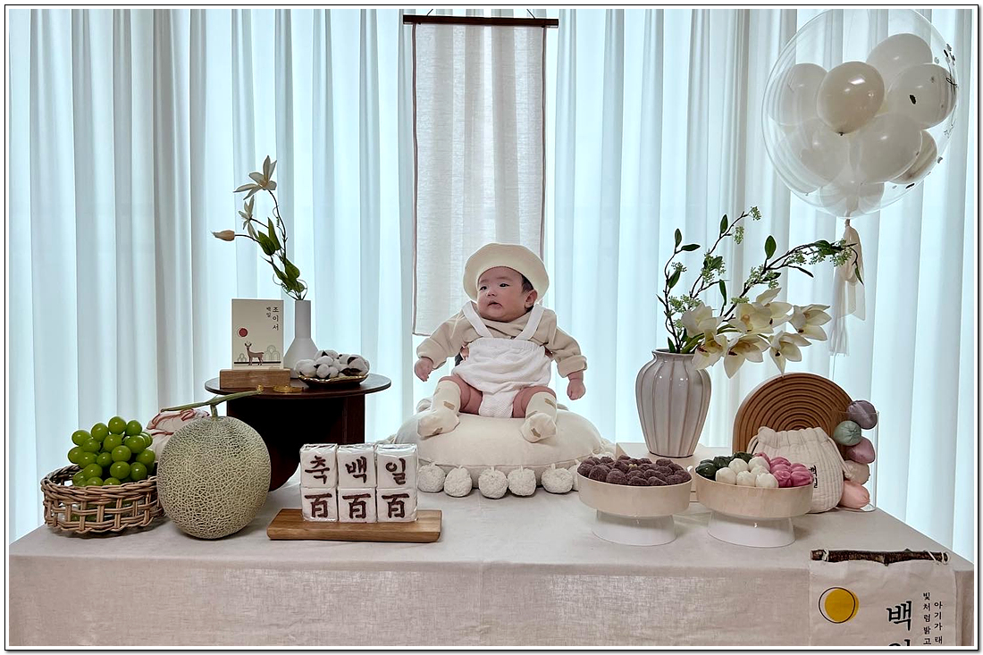 엄마, 아빠가 예쁘게 셋팅하여 집에서 백일 기념사진을 찍었네요