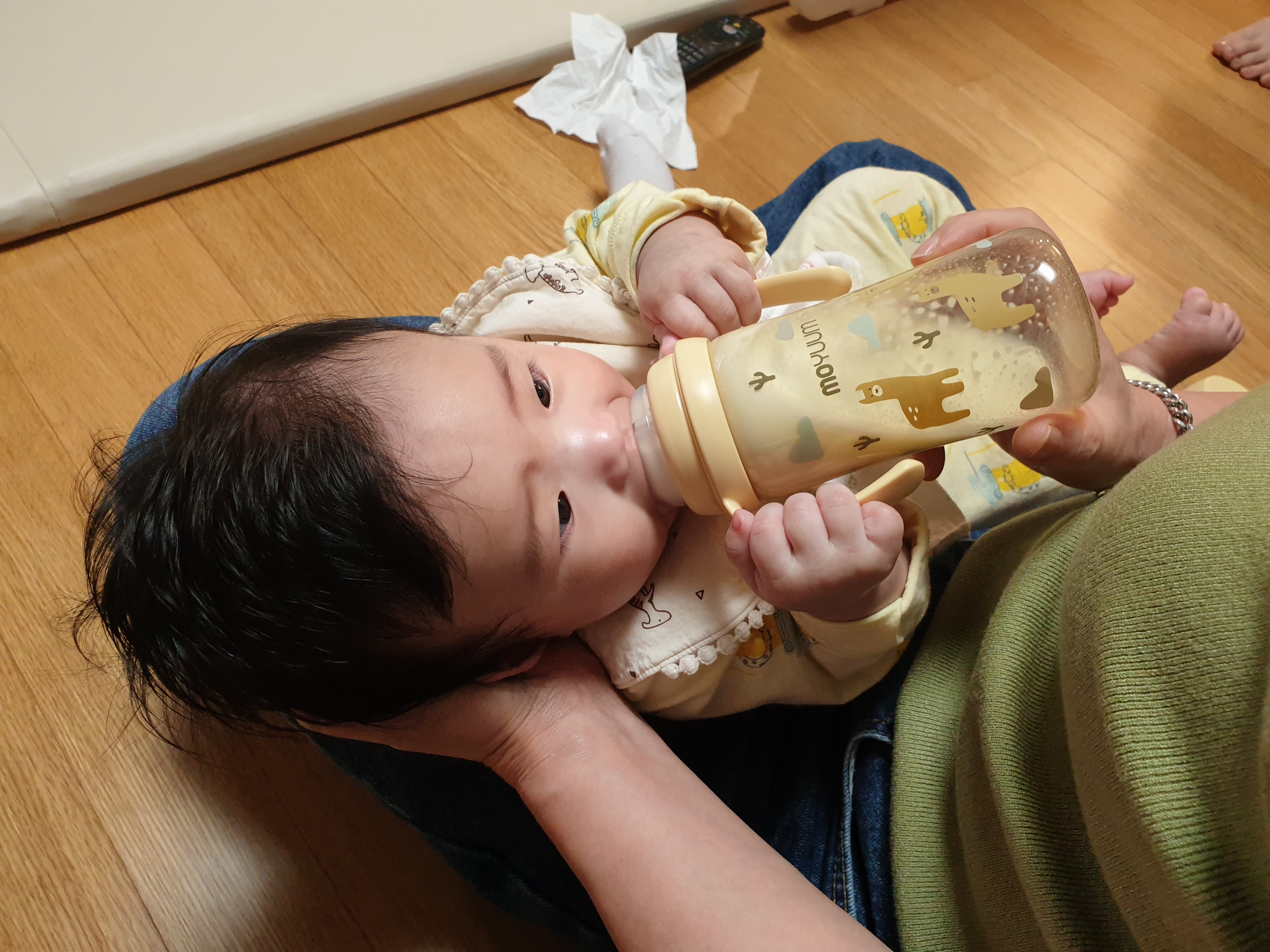 젖병을 두 손으로 꼭 잡고 먹기 시작하는 이서