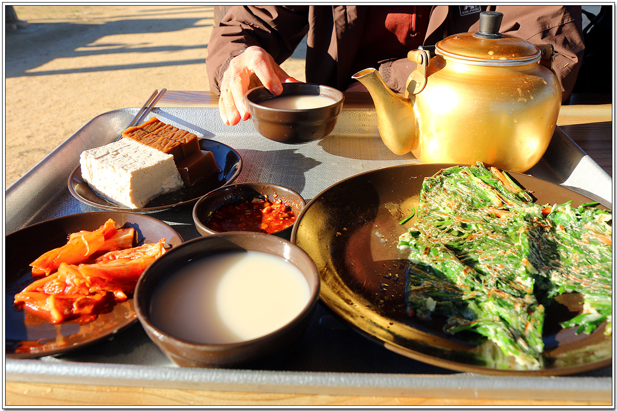 막걸리 한 주전자에 부추전, 두부&도토리묵 셋트인 '주모2'를 주문한다