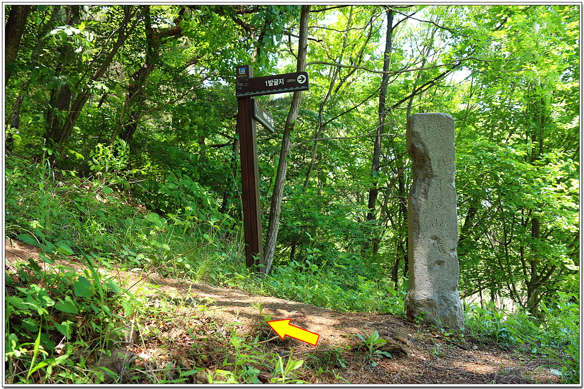 초입에 약 1, 2m 높이 사각 돌기둥과 이정표가 있다