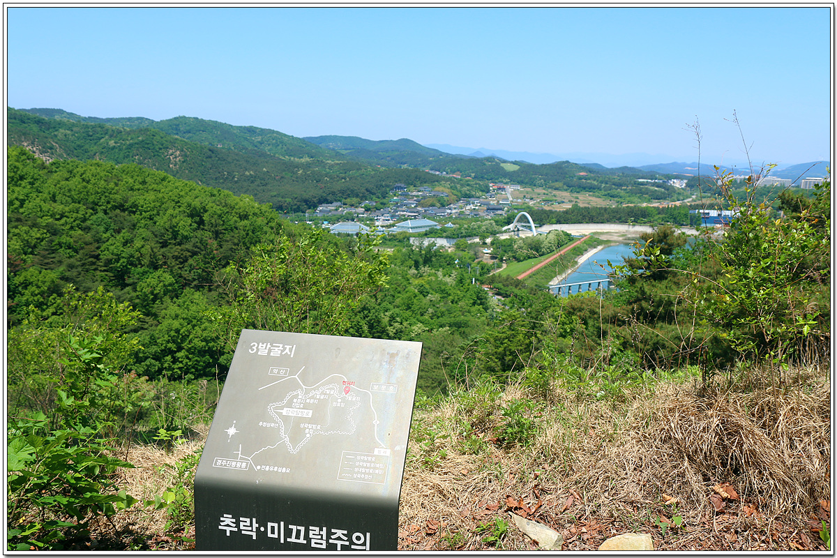 동쪽으로 시야가 트이면서 보문단지와 그 뒤에 멀리 길게 드러누워 있는 무장산 능선이 보인다