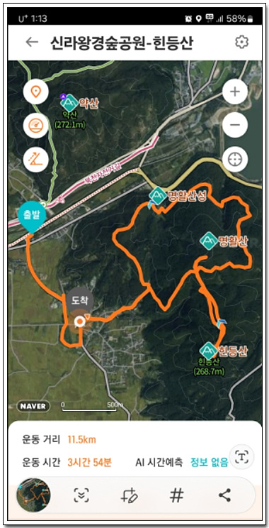 명활성 탐방로는 직진하는 길이지만, 먼저 왼쪽으로 큰명활산을 오른 후에 힌등산까지 갔다가 와서