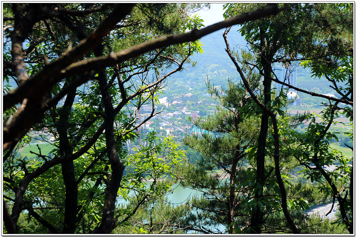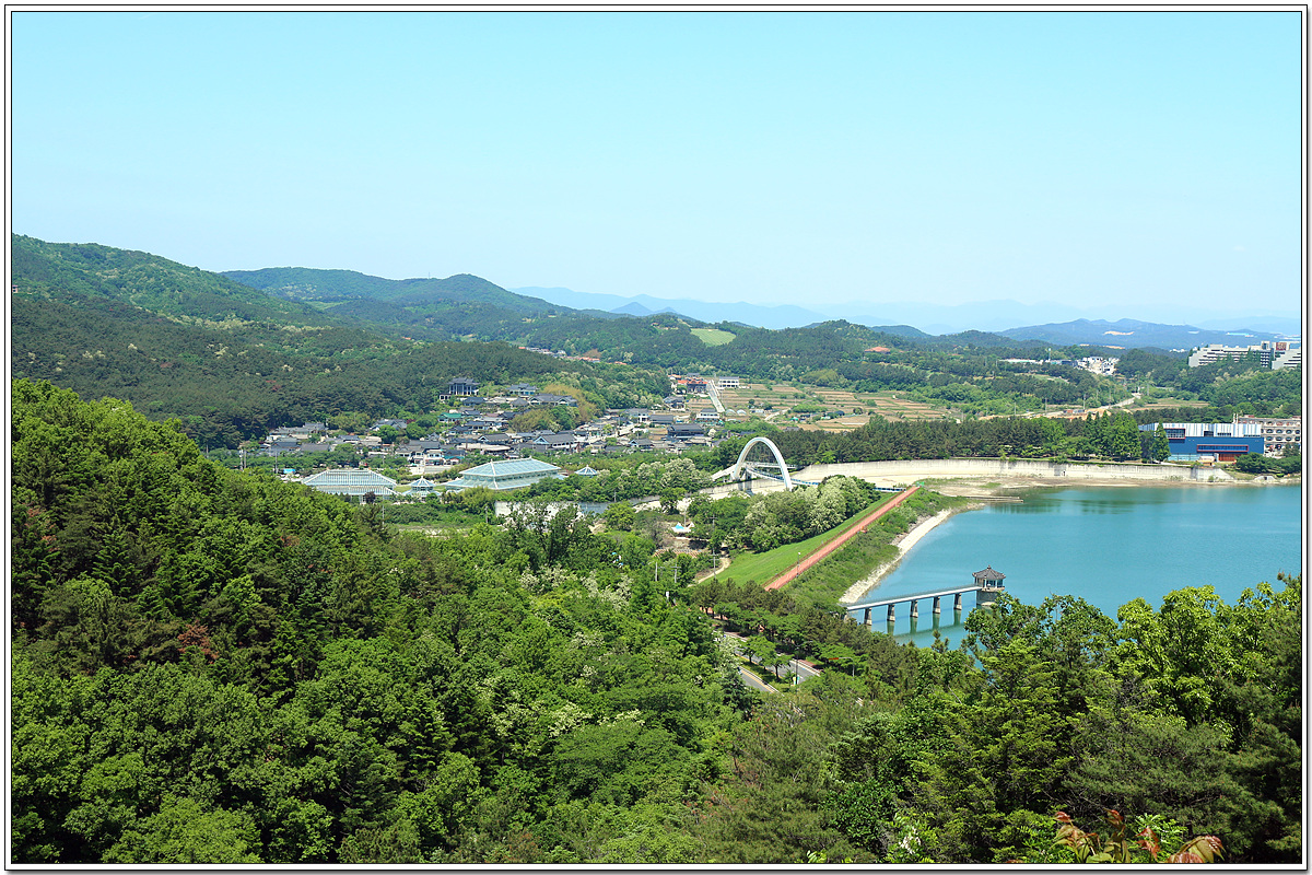 오른쪽 나뭇가지 사이로 간간이 보문호와 보문단지가 보이고