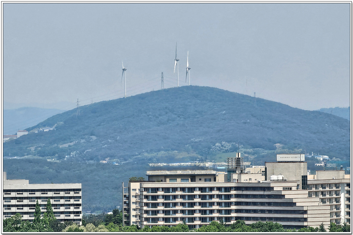 보문댐 뒤로는 천북면 서산의 풍력단지가 펼쳐진다