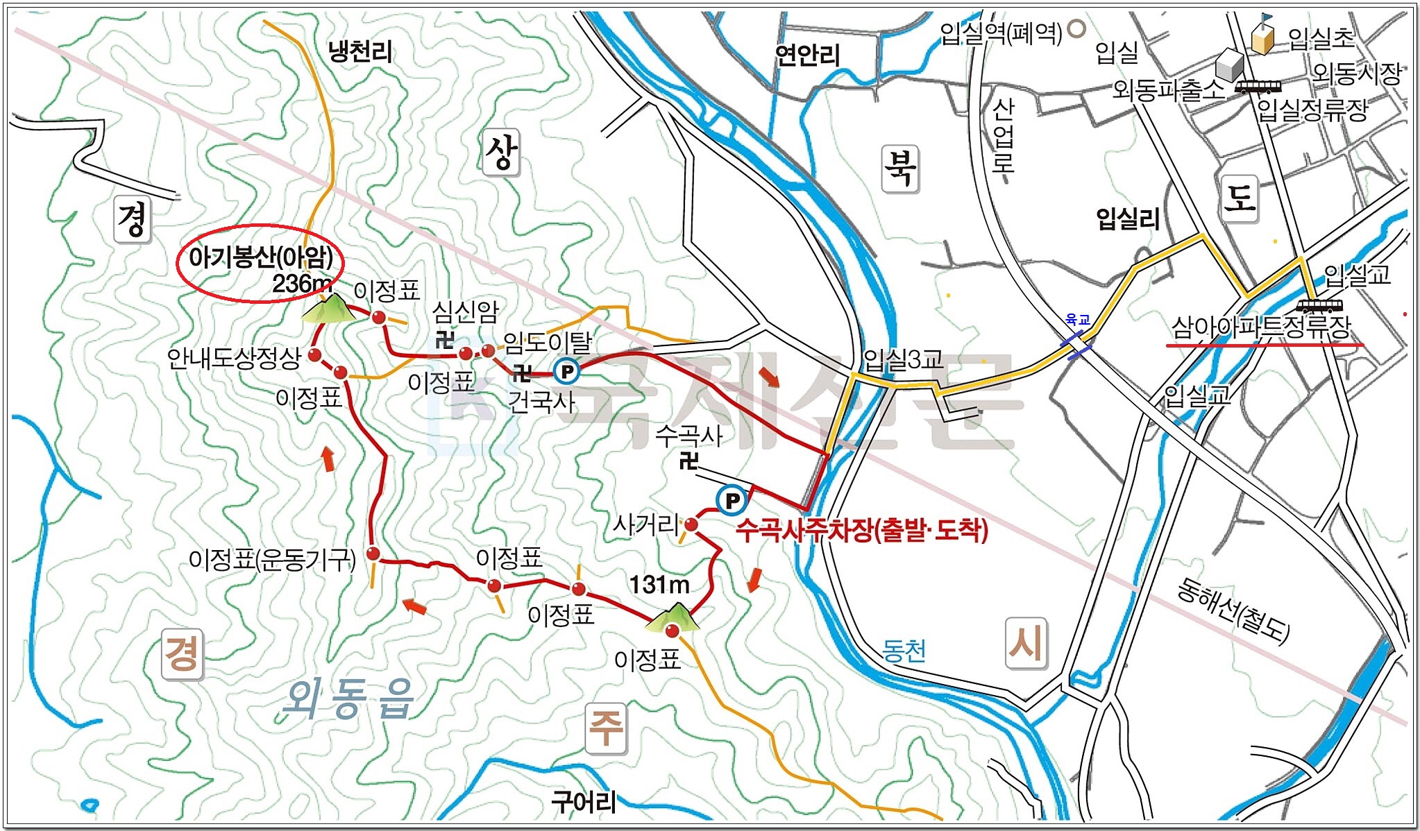 동천 앞에서 왼쪽으로 꺾어 버스에서 내렸던 입실 삼아아파트 버스정류장으로 간다