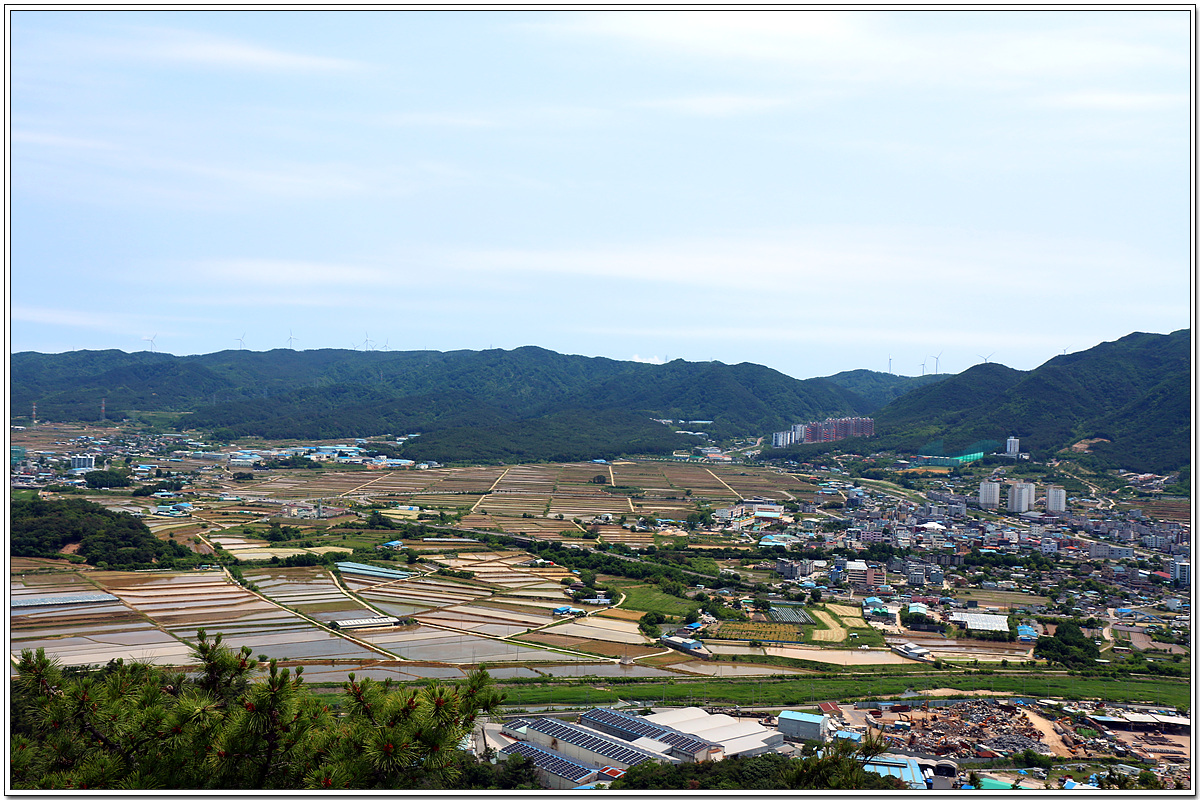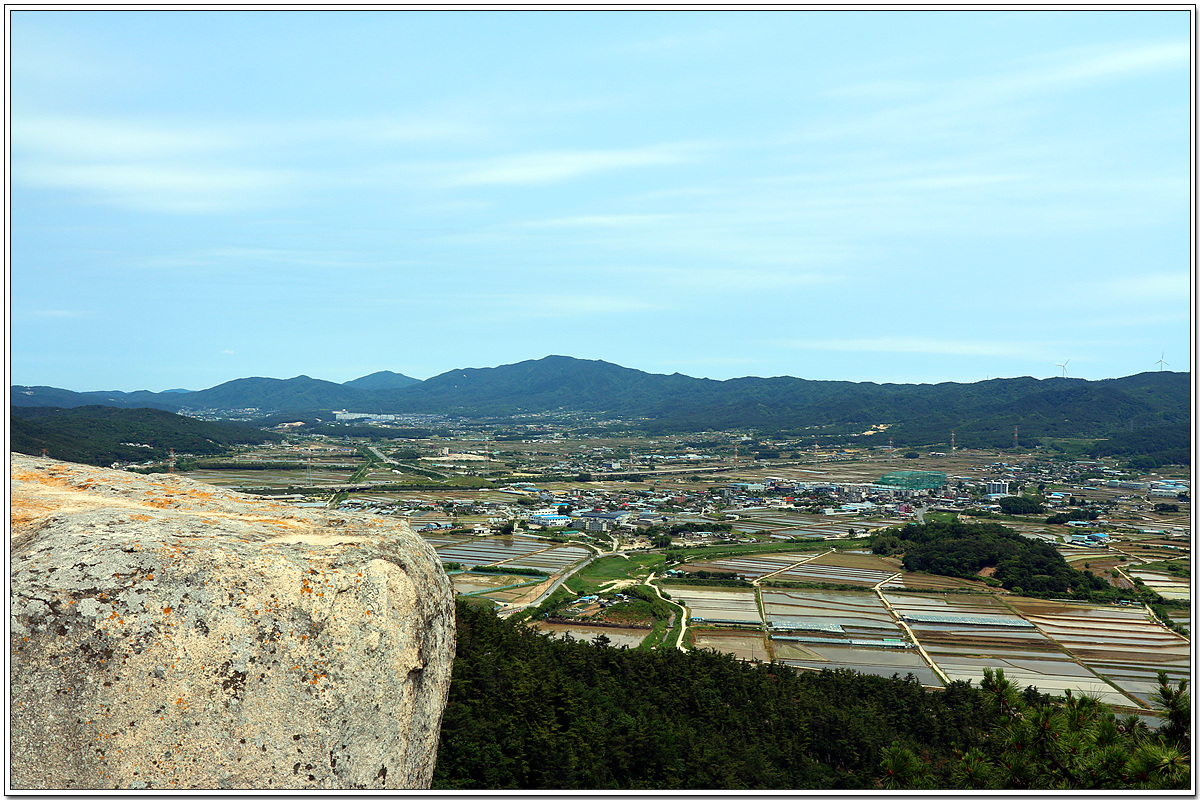 전망바위 위에 서면 외동읍 들판 뒤로 길다란 산맥이 늘어져 있는데