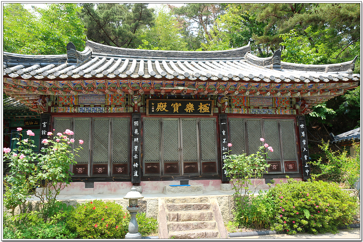 본전(本殿)인 극락보전(極樂寶殿)은 이중처마로 그 위엄을 달리하고 있다