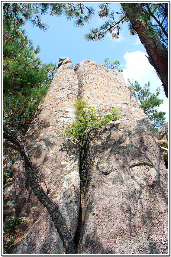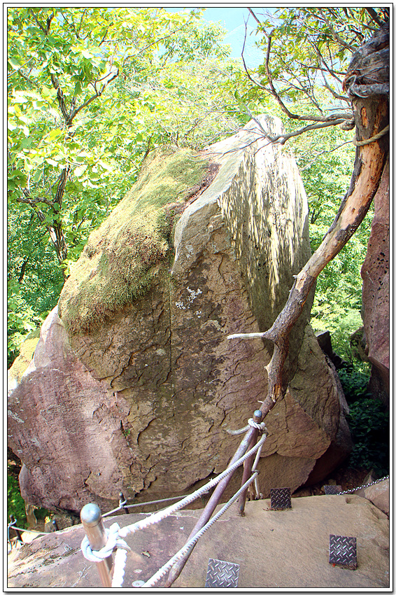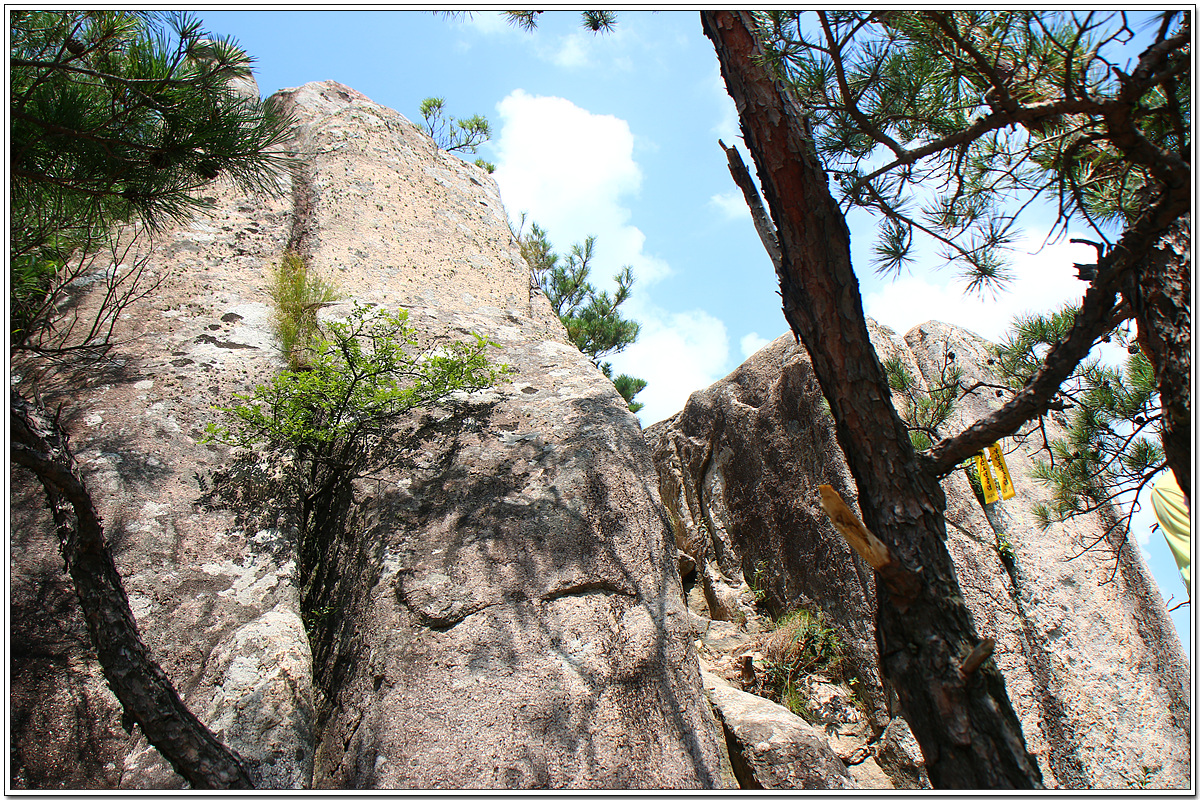 장군봉 정상의 바위가 마치 수십 개의 작은 바위를 계단식으로 쌓은 거대한 돌탑처럼 보인다