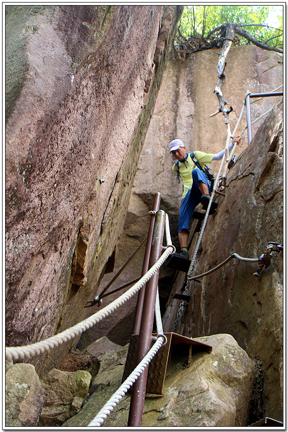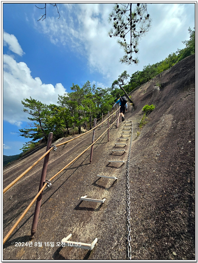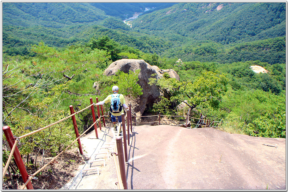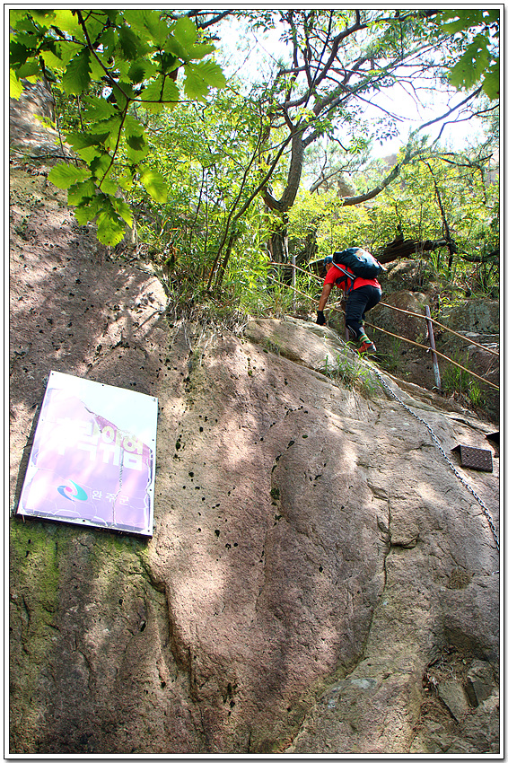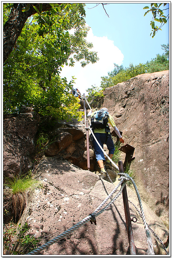 활활 타는 염천의 날씨에 로프를 잡고 수직 암벽을 기어오르려니 죽을 맛인데