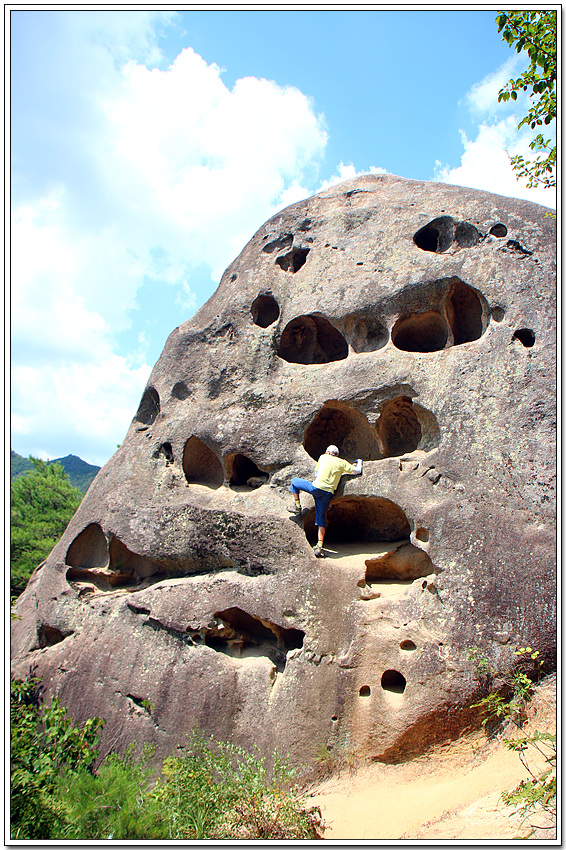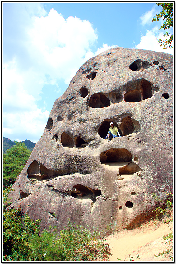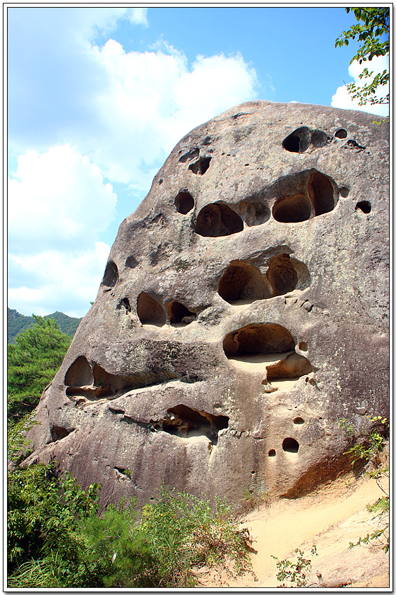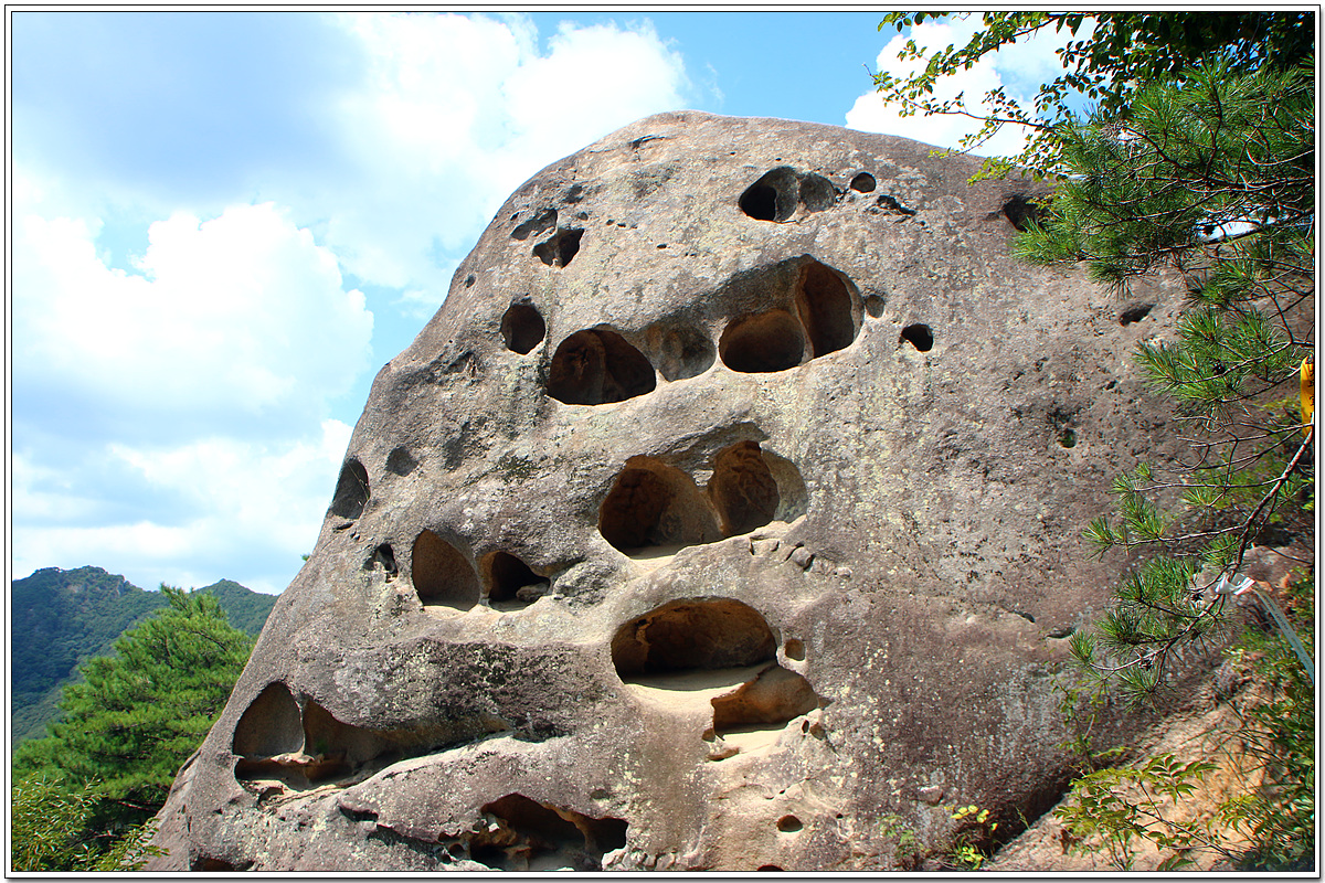 13:27 20여 개의 크고 작은 구멍이 뚫린 해골바위 (용 뜯어먹은 바위)