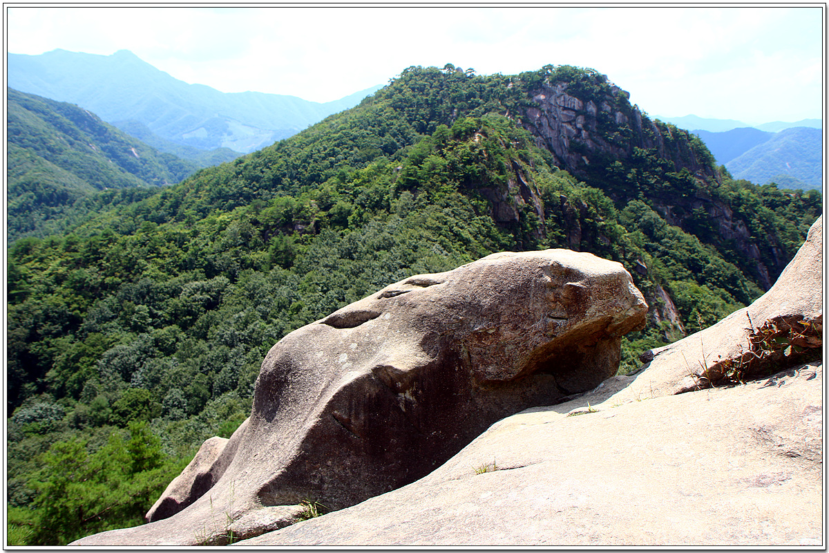 두꺼비바위 뒤로 두 번째 봉우리와 장군봉 정상이 줄을 지어 서 있는 것이 보인다