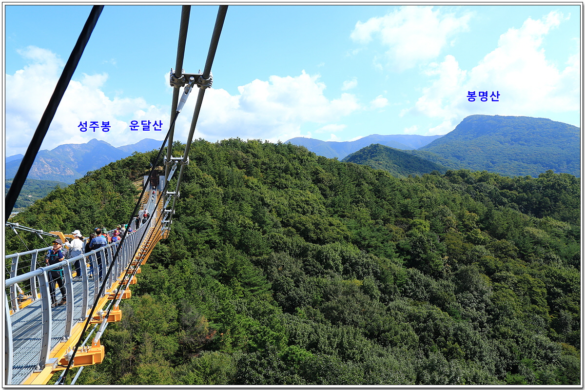 출렁다리 건너 왼쪽 너머로 운달산과 성주봉이 보이고
