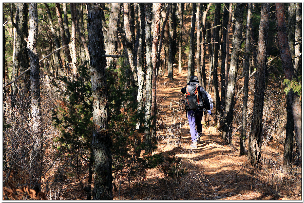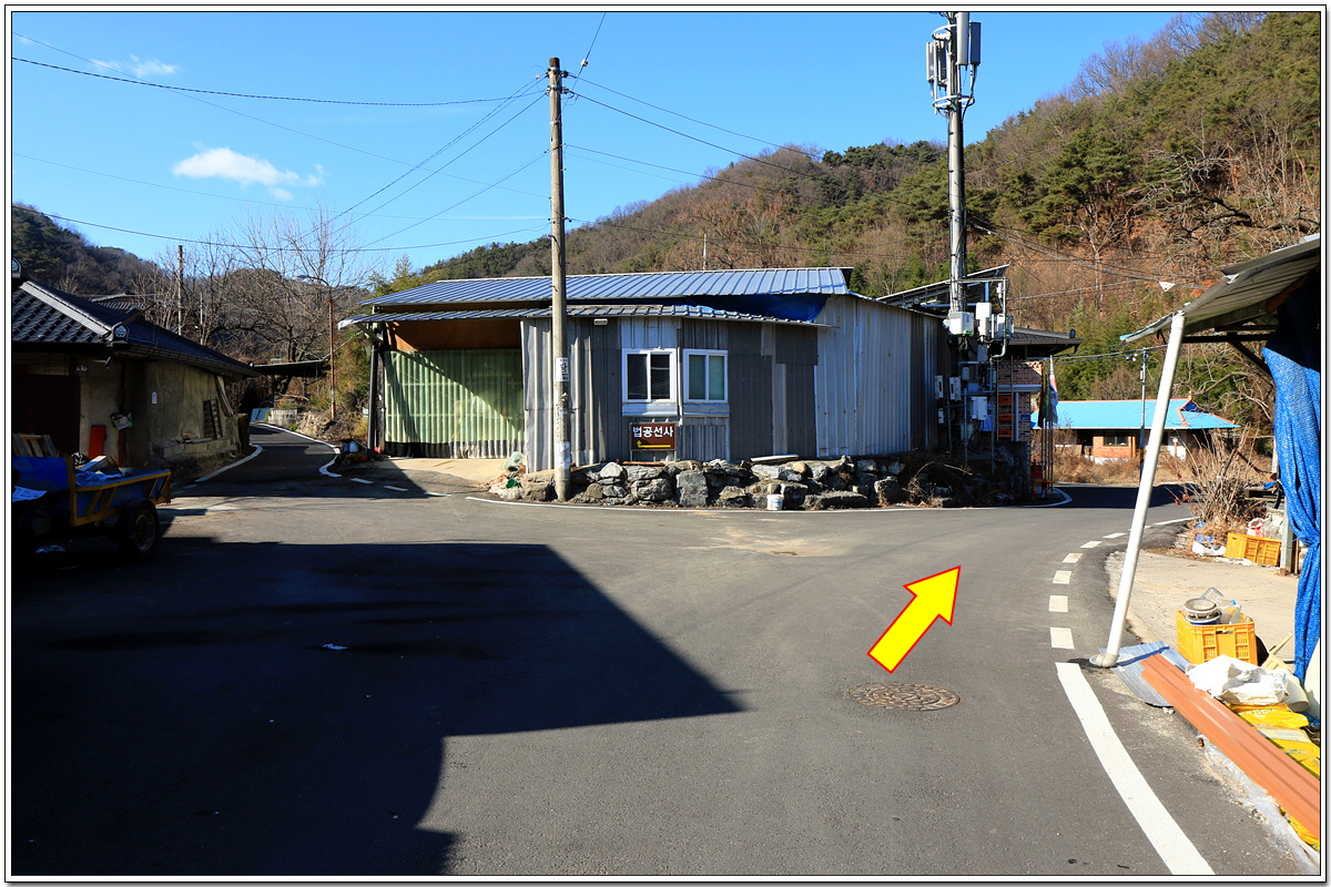 완만한 오르막 도로를 따라 가다가 왼쪽에 이정표가 있는 곳에서 산으로 오른다