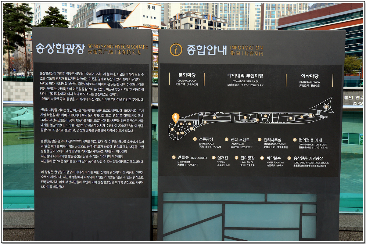 역사마당은 역사 체험 및 기념공간이고, 다이내믹 부산마당은 시민의 활동과 휴식 공간이 되고