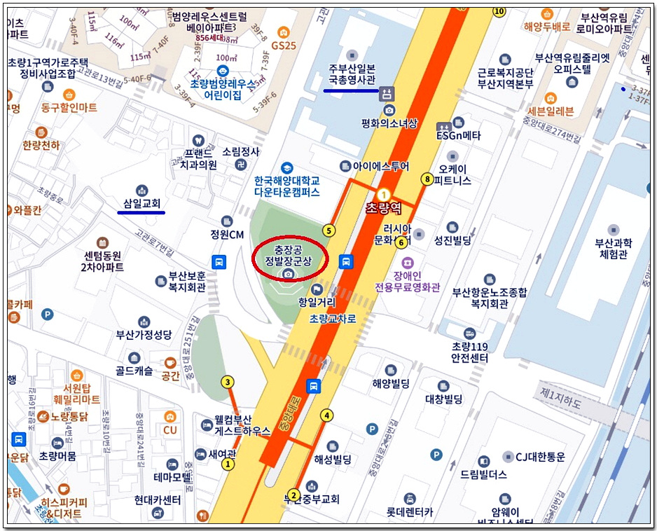 송상현광장은 부산의 남북을 잇는 중앙대로의 부산진구 양정동-삼전교차로 구간에