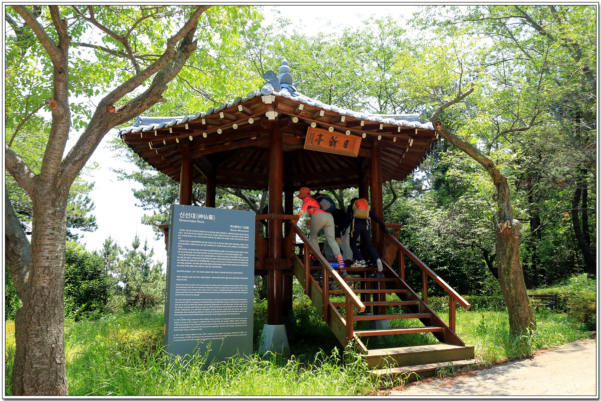 일신정 사거리에서 정면 직진길로 30m정도 오르다가 오른쪽 계단길로 오르면 신선대 정상이다