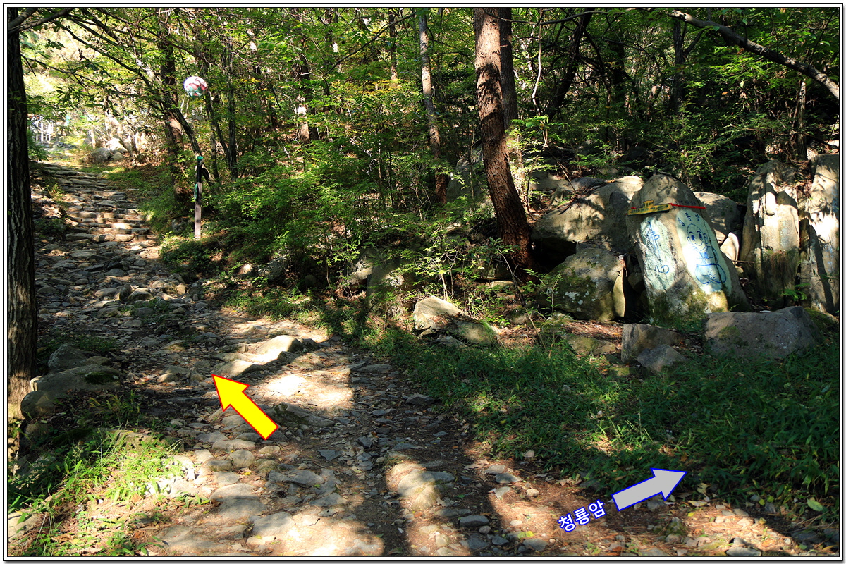 오른쪽은 장군암(선바위)과 합장바위 입구를 지나 장산 정상으로 오르는 길이다