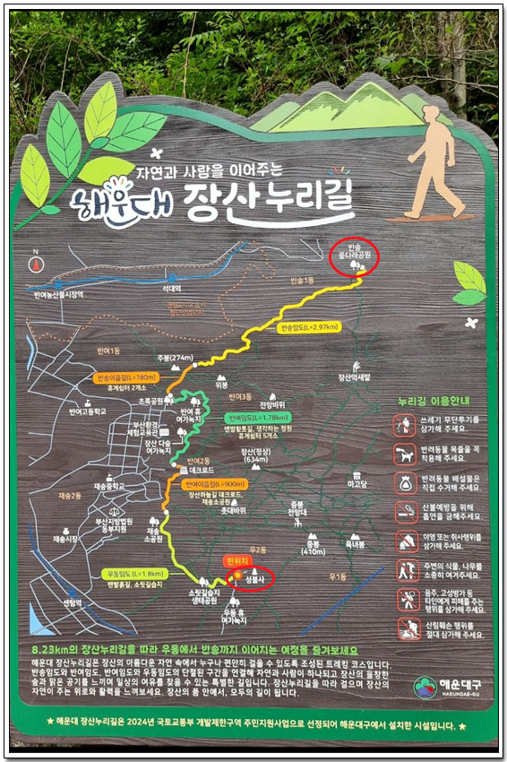 안내도의 주황색 실선의 이음길(반여이음길, 반송이음길)이 이번에 새로 연결된 구간이다
