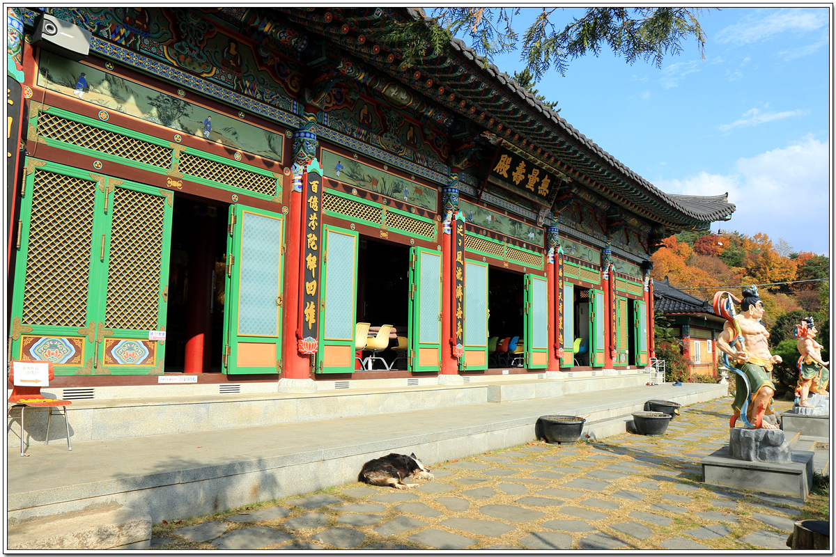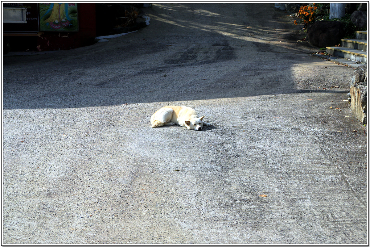 절 입구 왼쪽에 먼저 눈에 띄는 견사에는 개 한 마리가 누워 자고 있다