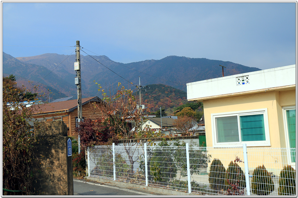 가천정류장에서 하차하여 가는데 강당마을 너머로 신불산이 모습을 보인다