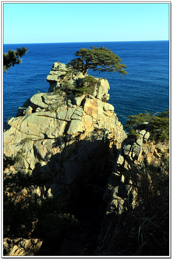 정자 앞의 바다에 수직으로 솟은 암석 위에는 하조대의 상징인 200년 된 소나무 한 그루가 그림처럼 서 있다