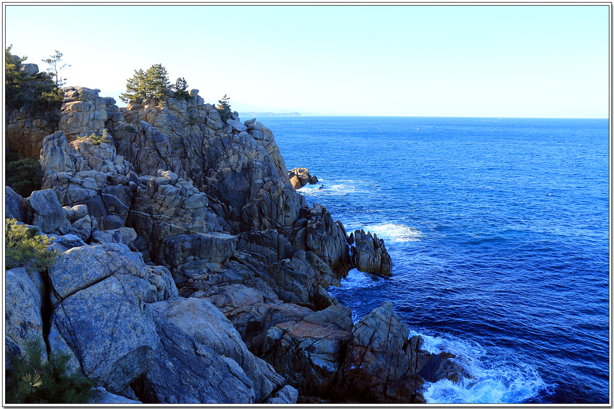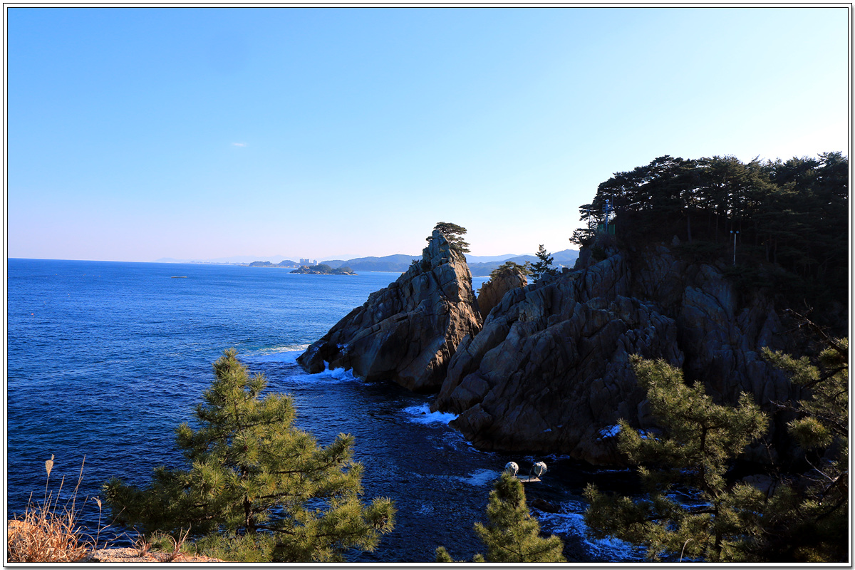 동해안에서는 보기 드문 섬인 기사문해변 앞의 조도(鳥島) 너머로 지나온 동산해변 쪽이 모습을 보인다