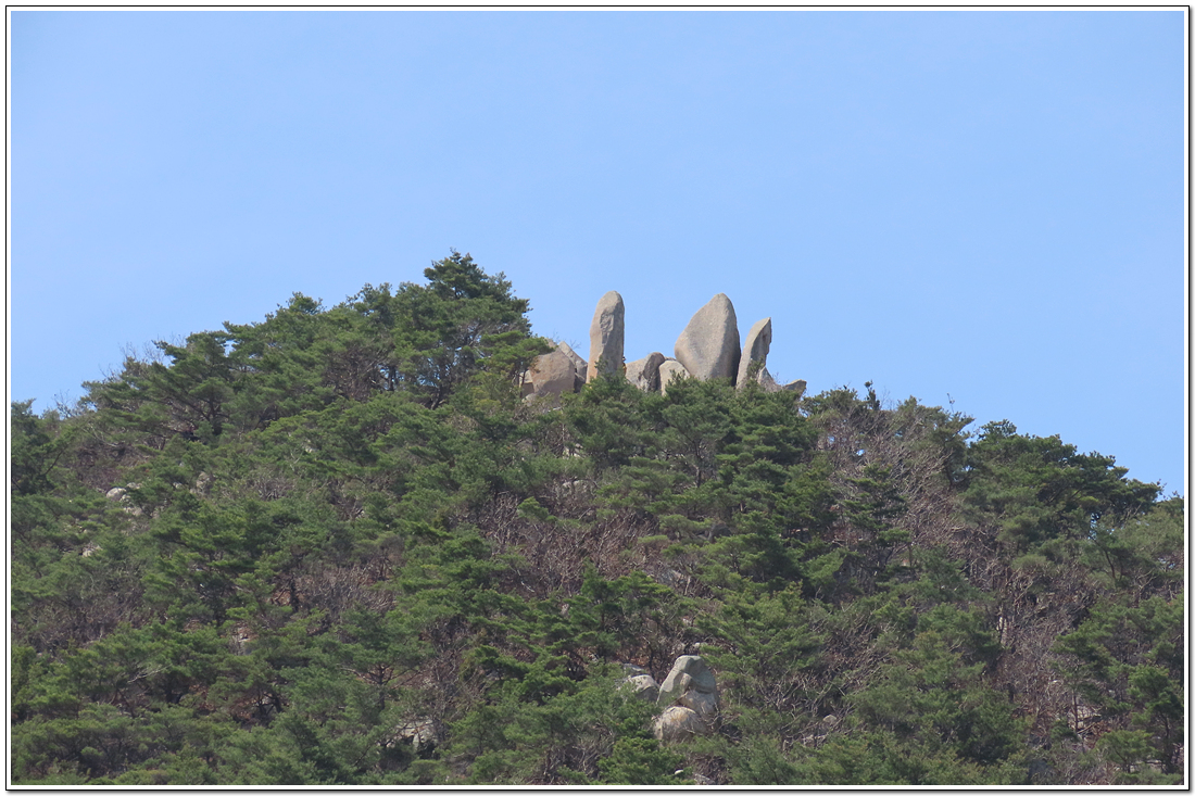 하산 길 뒤돌아 본 마석산 바위봉우리 모습