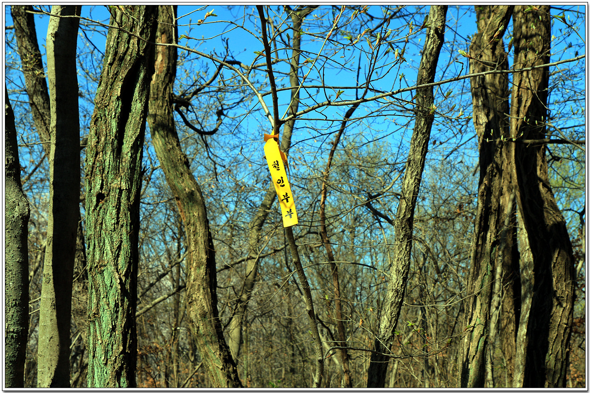 낙석 방지 울타리가 끝나는 지점에 있는 탐방 안내판 팻말을 따라 산길을 오르도록 안내하고 있었는데