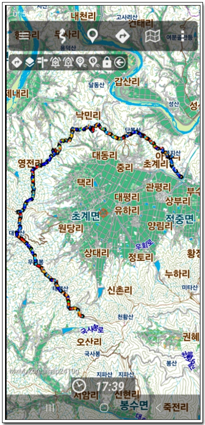 지난번과 같이 큰고개에서 시작을 하여 왼쪽 태백산으로 부터 지난번 날머리 적중교 삼거리까지 약17km를 걷는다