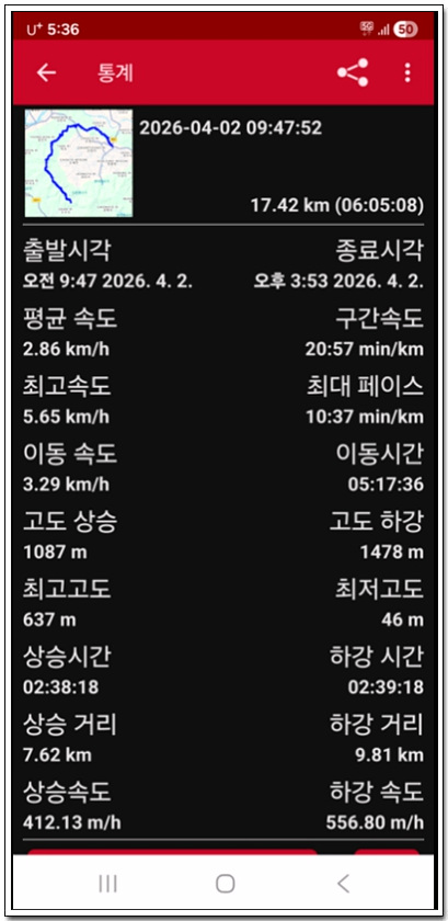 3월 26일 15.06km를 4시간 57분동안 걸었고, 오늘 17.42km를 6시간 5분동안 걸었으니