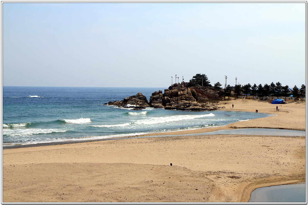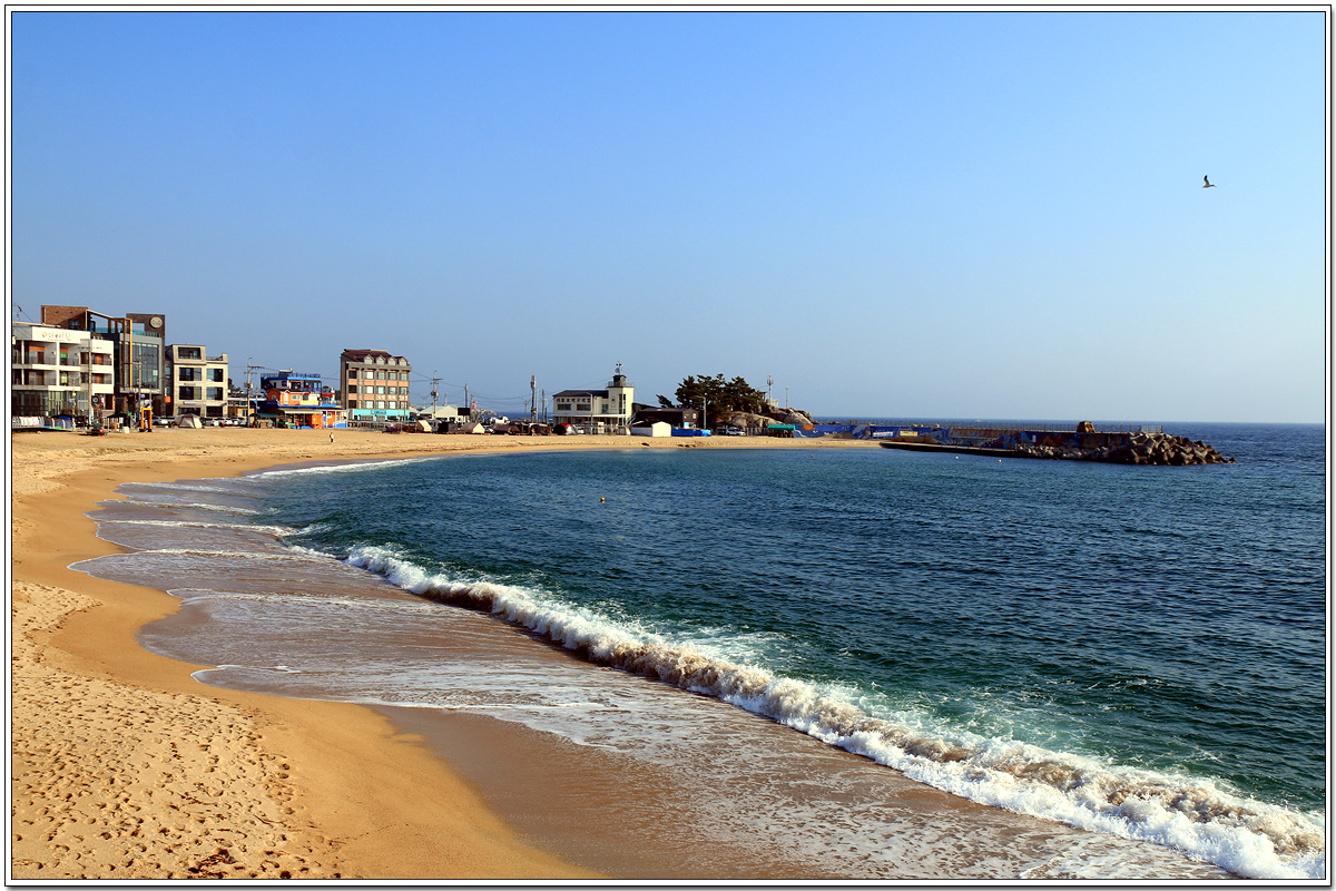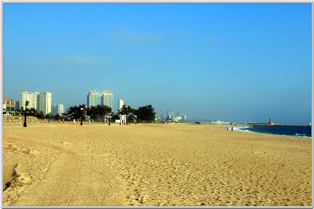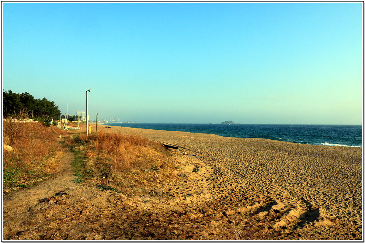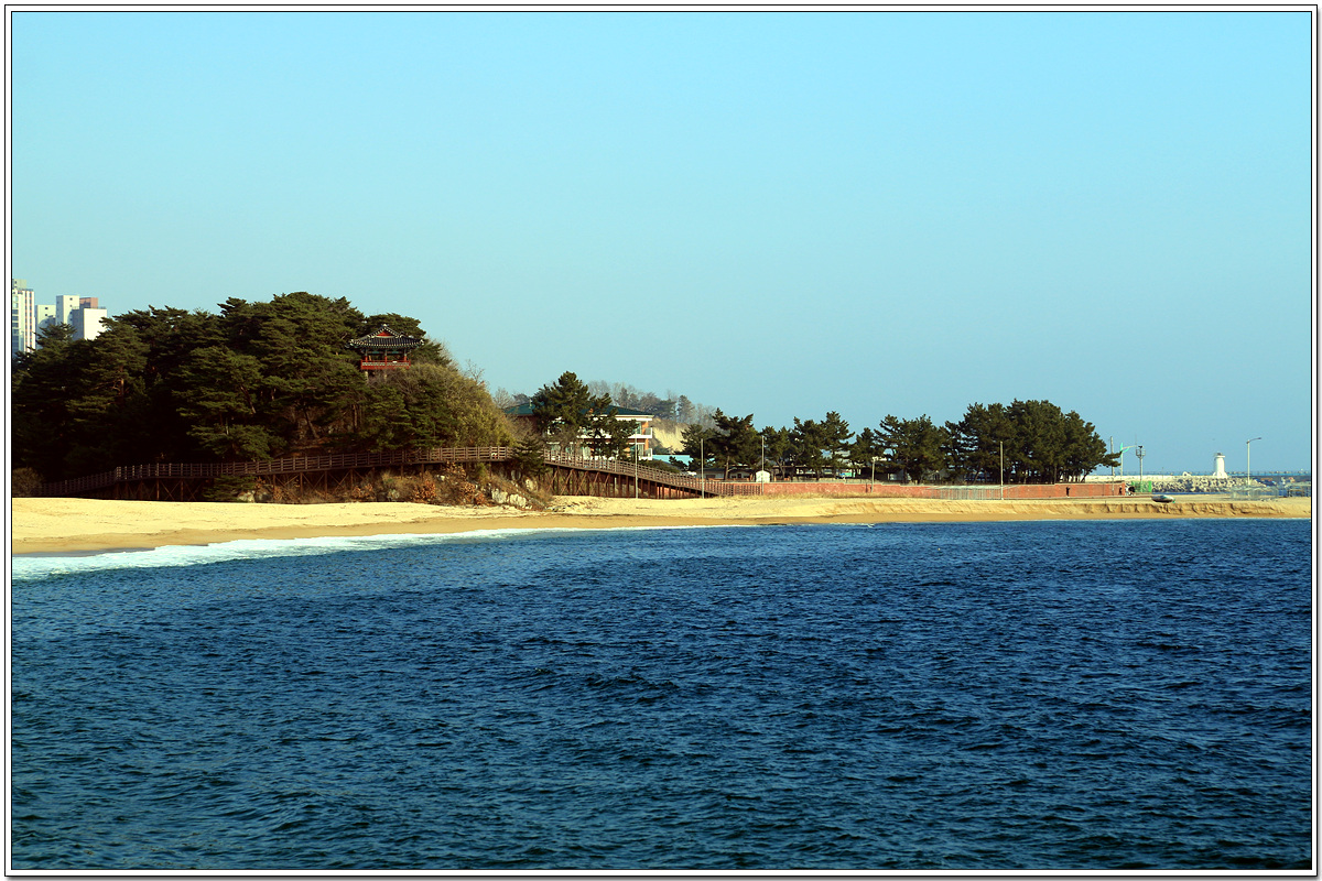 백사장은 활처럼 휘었고 오른쪽엔 붉은 등대가 서 있는데
