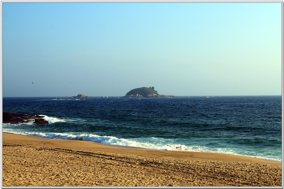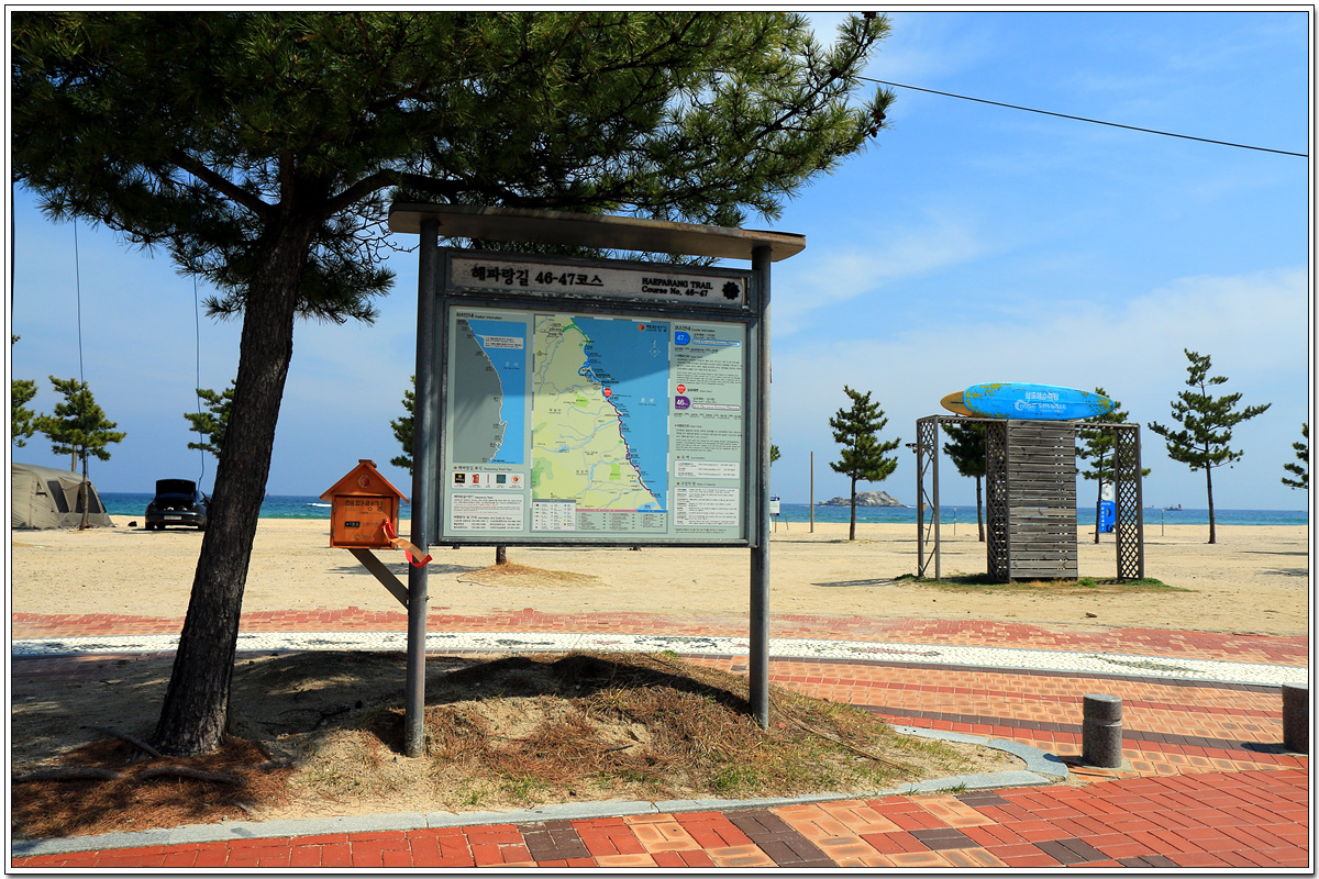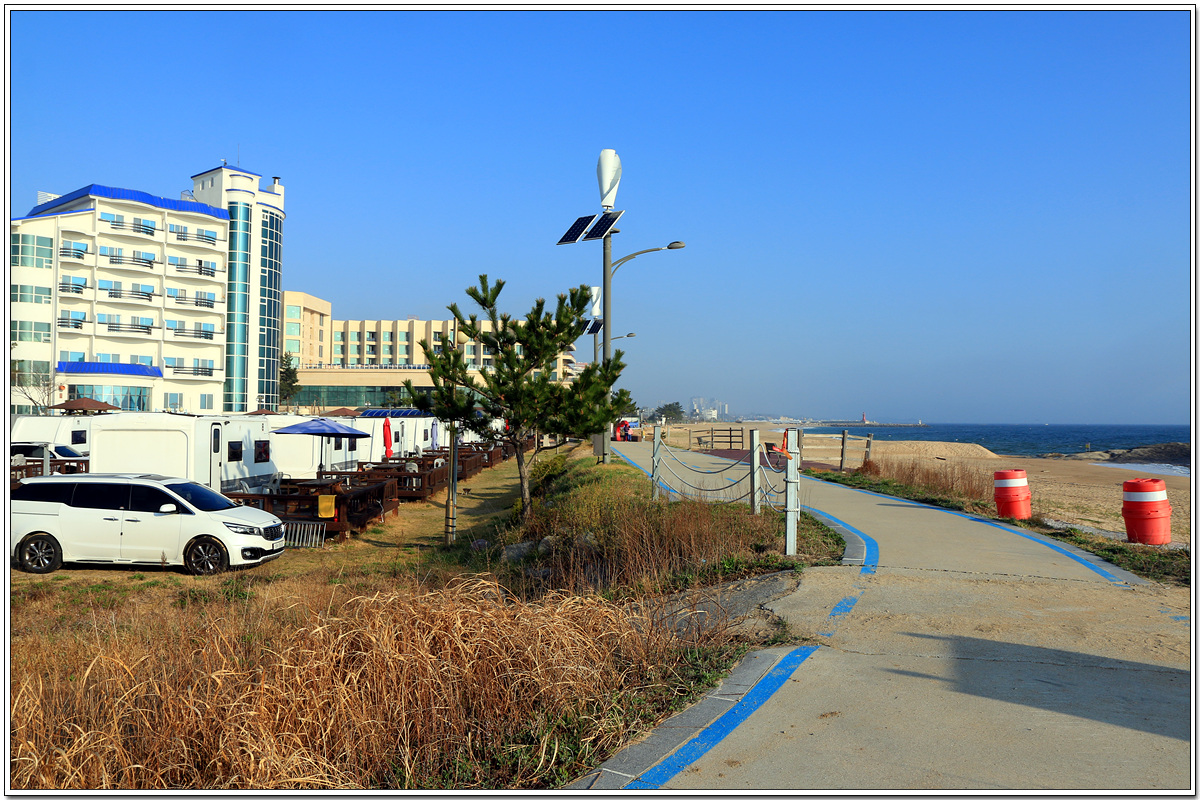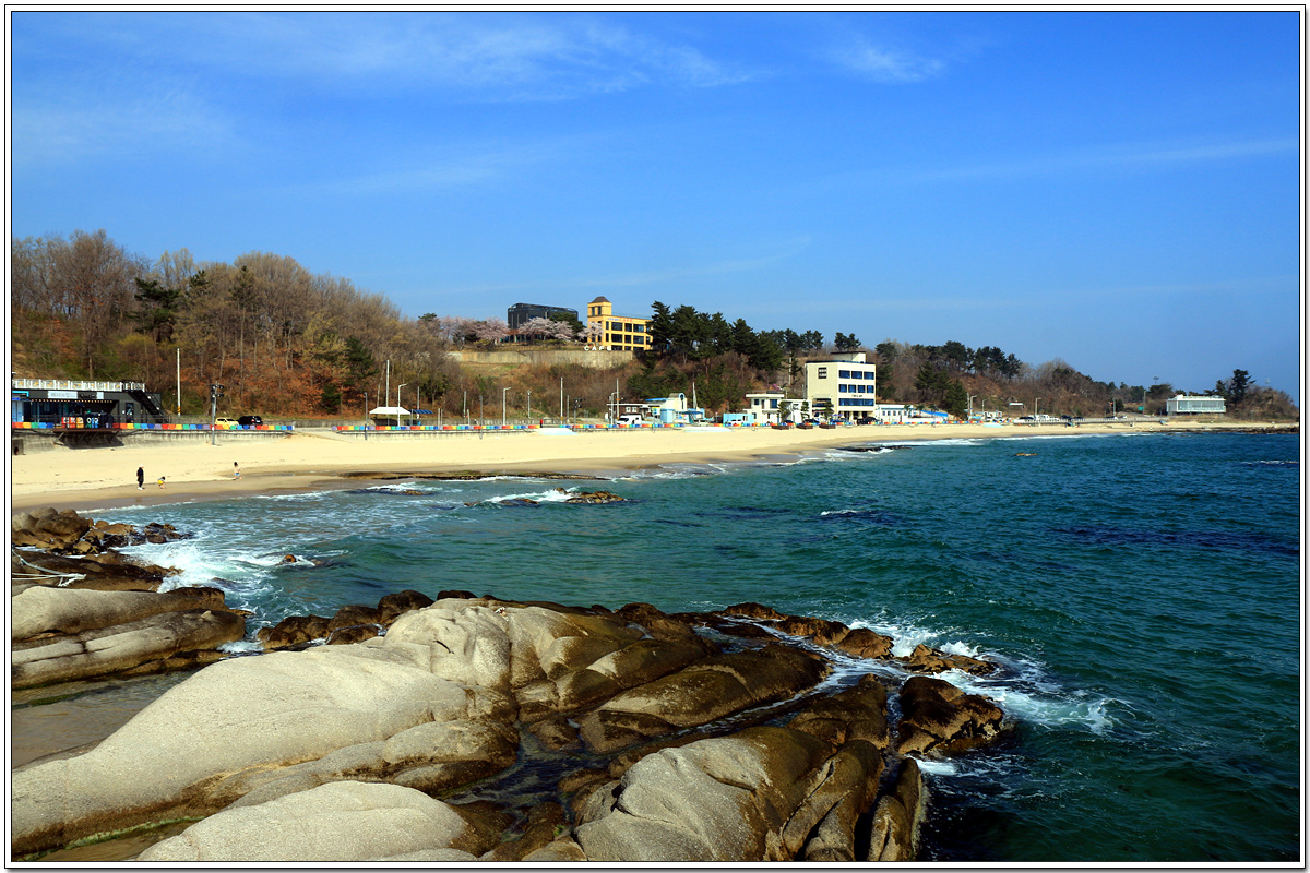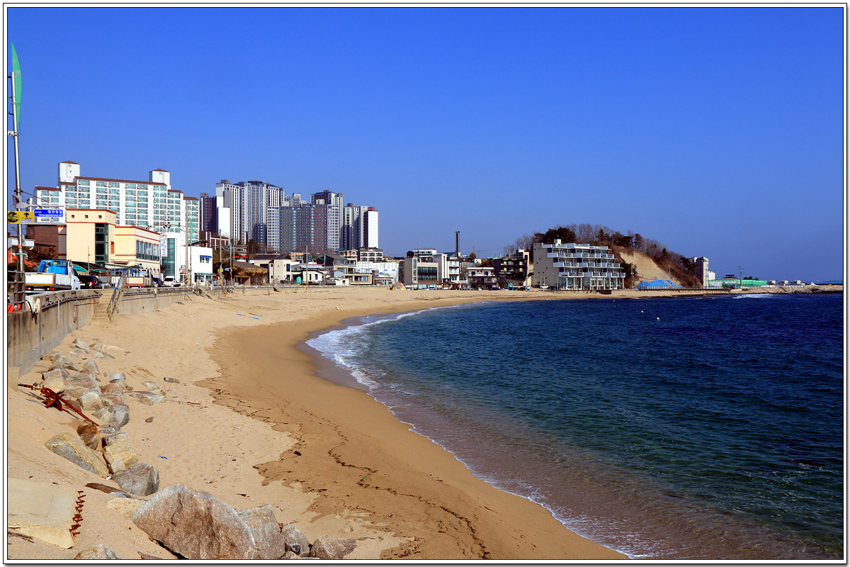 백사장은 활처럼 휘었고 오른쪽엔 붉은 등대가 서 있는데